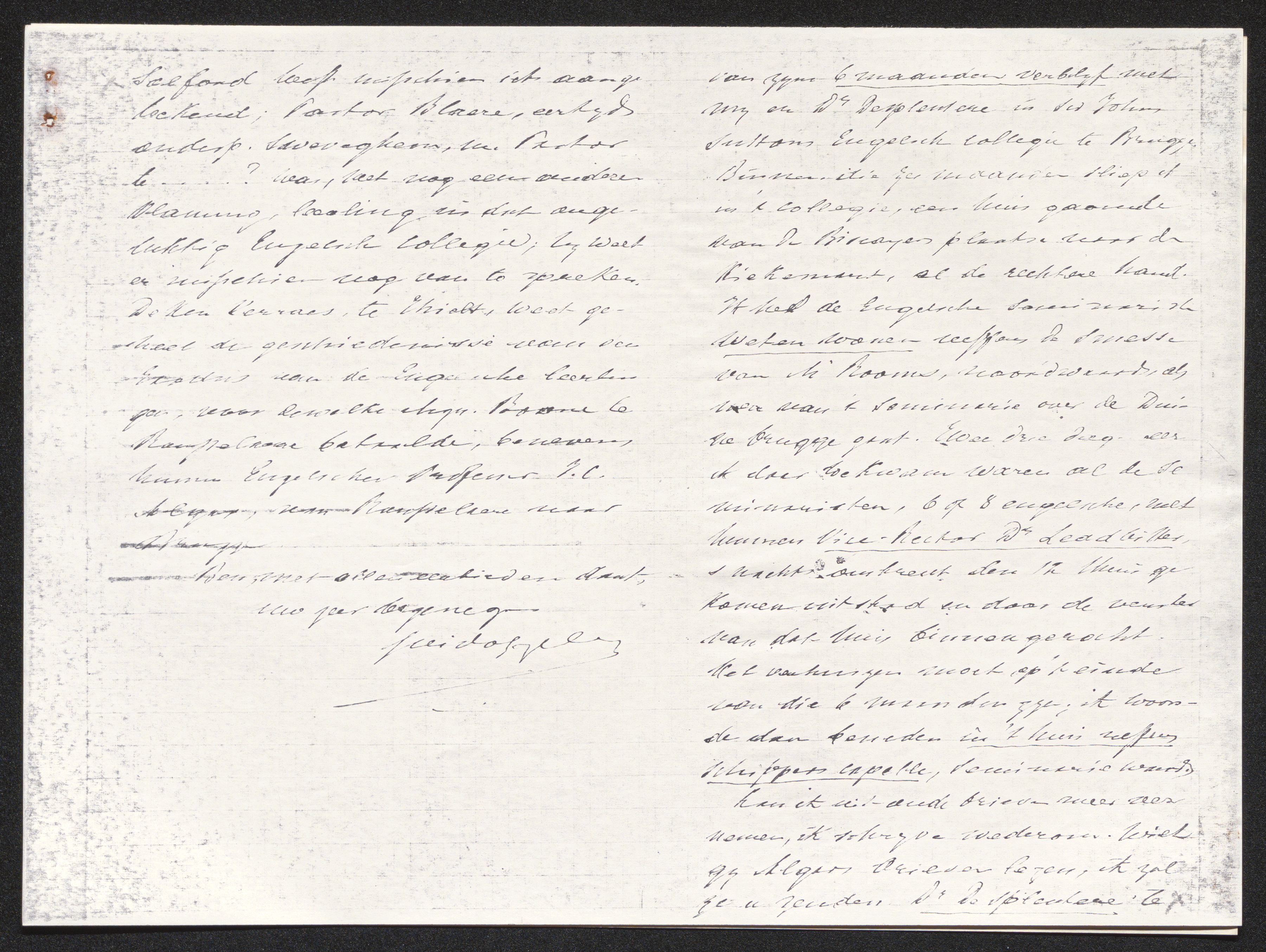 Kan ik uit oude brieven meer vernemen, ik schrijve wederom. Wilt gij Algars brieven lezen, ik zal ze u zenden. Dr Desplentere te p3Salford heeft misschien iets aangetekend; Pastoor Blaere, eertijds onderpastoor Sweveghem, nu Pastoor te ….?[7] was, met nog een oudere Vlaming, leerling in dat ongelukkig Engelsch collegie; hij weet er misschien nog van te spreken. Deken Verraes, te Thielt, weet geheel de geschiedenisse van den Exodus van de Engelsche leerlingen, voor dewelke Mgr. Boone te Rousselaere betaalde, benevens hunnen Engelschen professor J.C. Algar, van Rousselaere naar Brugge.