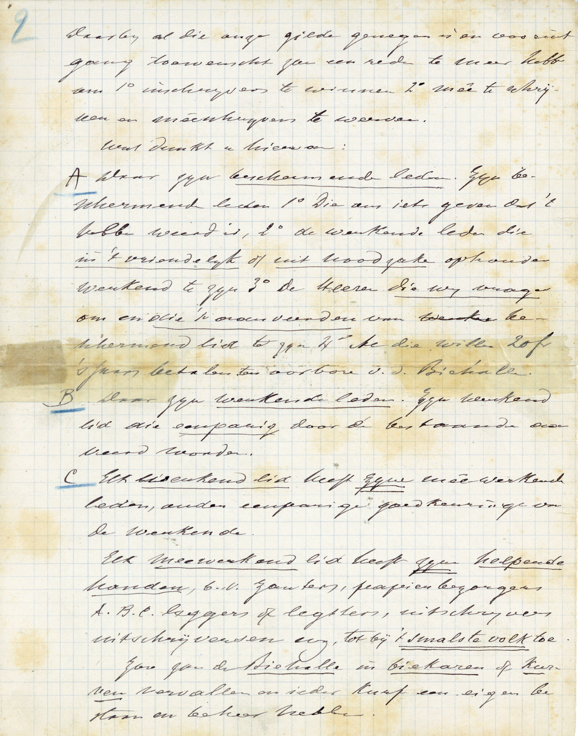 A[3] Daar zijn beschermende leden. Zijn beschermende leden 1° Die ons iets geven dat 't hebben weerd is, 2° de werkende leden die in 't vriendelijk of uit noodzake ophouden werkend te zijn 3° de Heeren die wij vragen om en die 't aanveerden van beschermend lid te zijn 4° Al die willen 20 fr 's jaars betalen ten oorbore van de Biehalle.