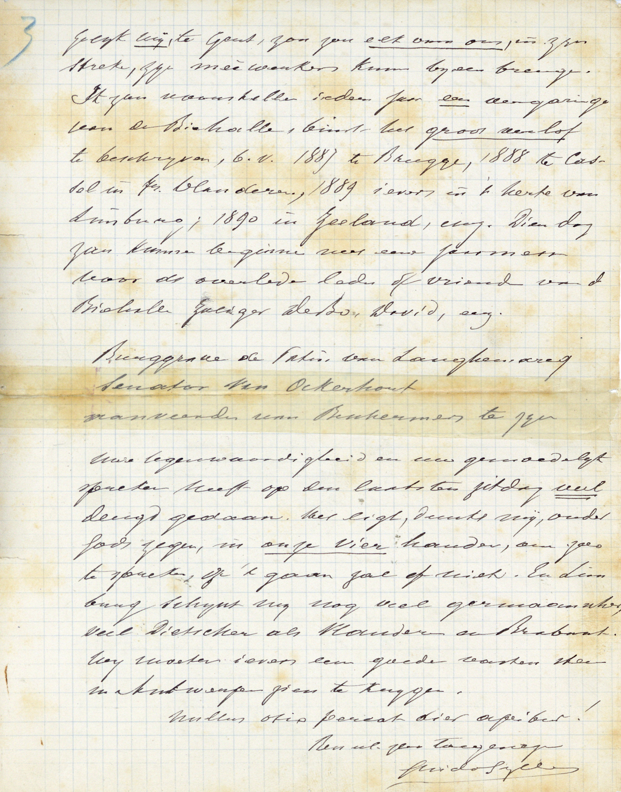 p53Gelijk wij, te Gent,[11] zoo zou elk van ons, in zijn streke, zijn meêwerkers kunnen bijeen brengen. Ik zou voorstellen ieder jaar een vergaringe van de Biehalle, binst het groot verlof te beschrijven, b.v. 1887 te Brugge, 1888 te Cassel in Fransch Vlanderen, 1889 ievers in 't herte van Limburg; 1890 in Zeeland, enz. Dien dag zou kunnen beginnen met eene jaarmesse voor de overleden leden of vrienden van de Biehalle zaliger De Bo, David, enz.[12]
