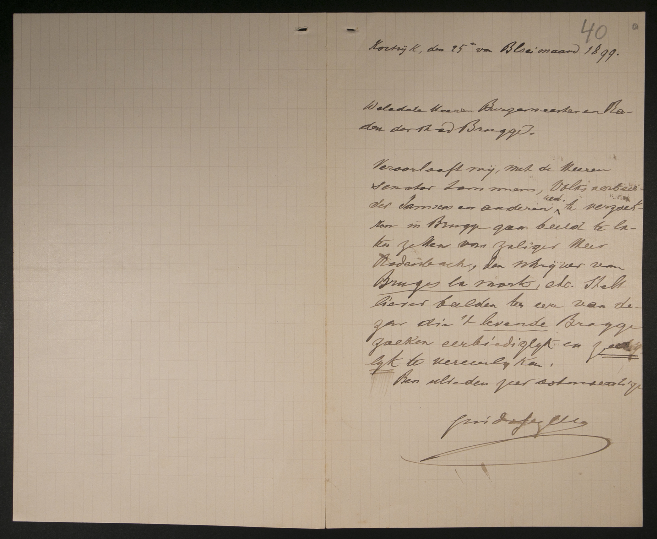 Titel25/05/1899, Kortrijk, Guido Gezelle aan Burgemeester Amedée Visart de Bocarmé en raden van de Stad Brugge
