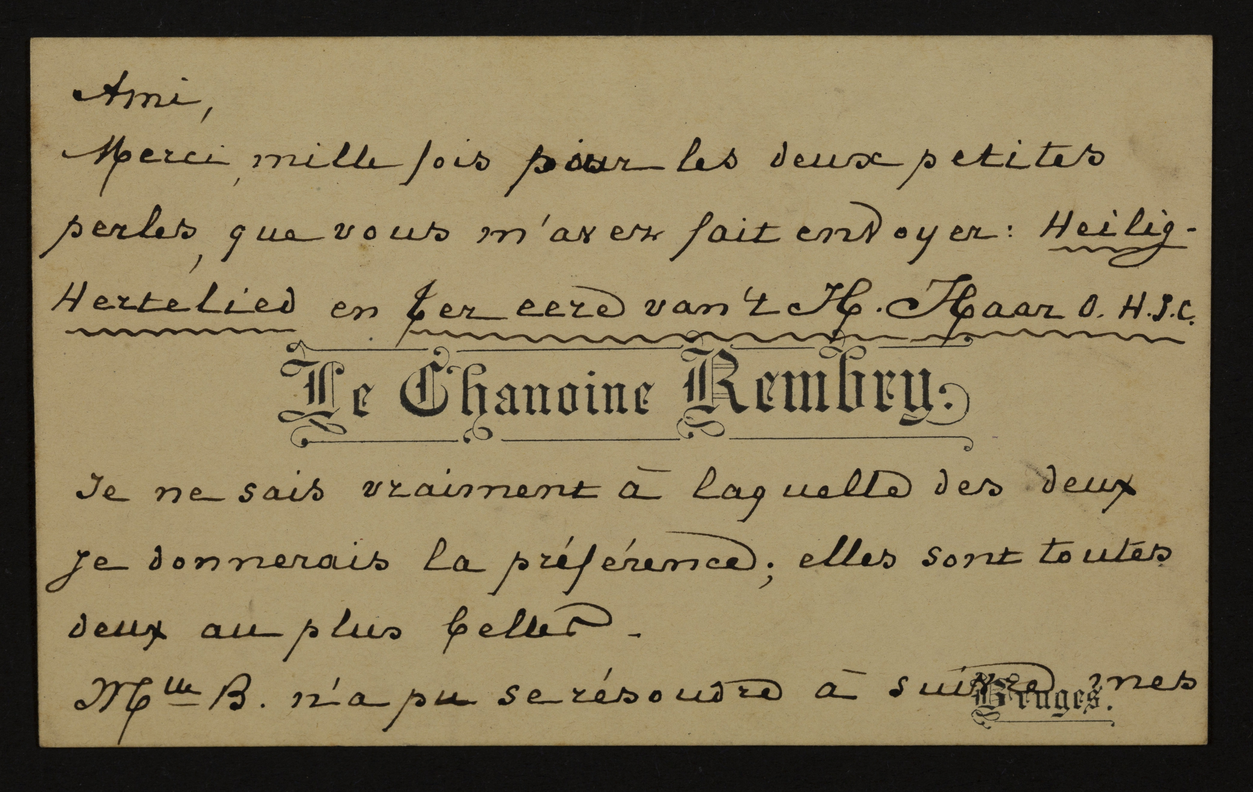 Merci mille fois pour les deux petites perles que vous m’avez fait envoyer: Heilig-Hertelied[1] en Ter eere van ‘t H. Haar O.H.J.C.[2] Je ne sais vraiment à laquelle des deux je donnerais la préférence; elles sont toutes deux aux plus belles.