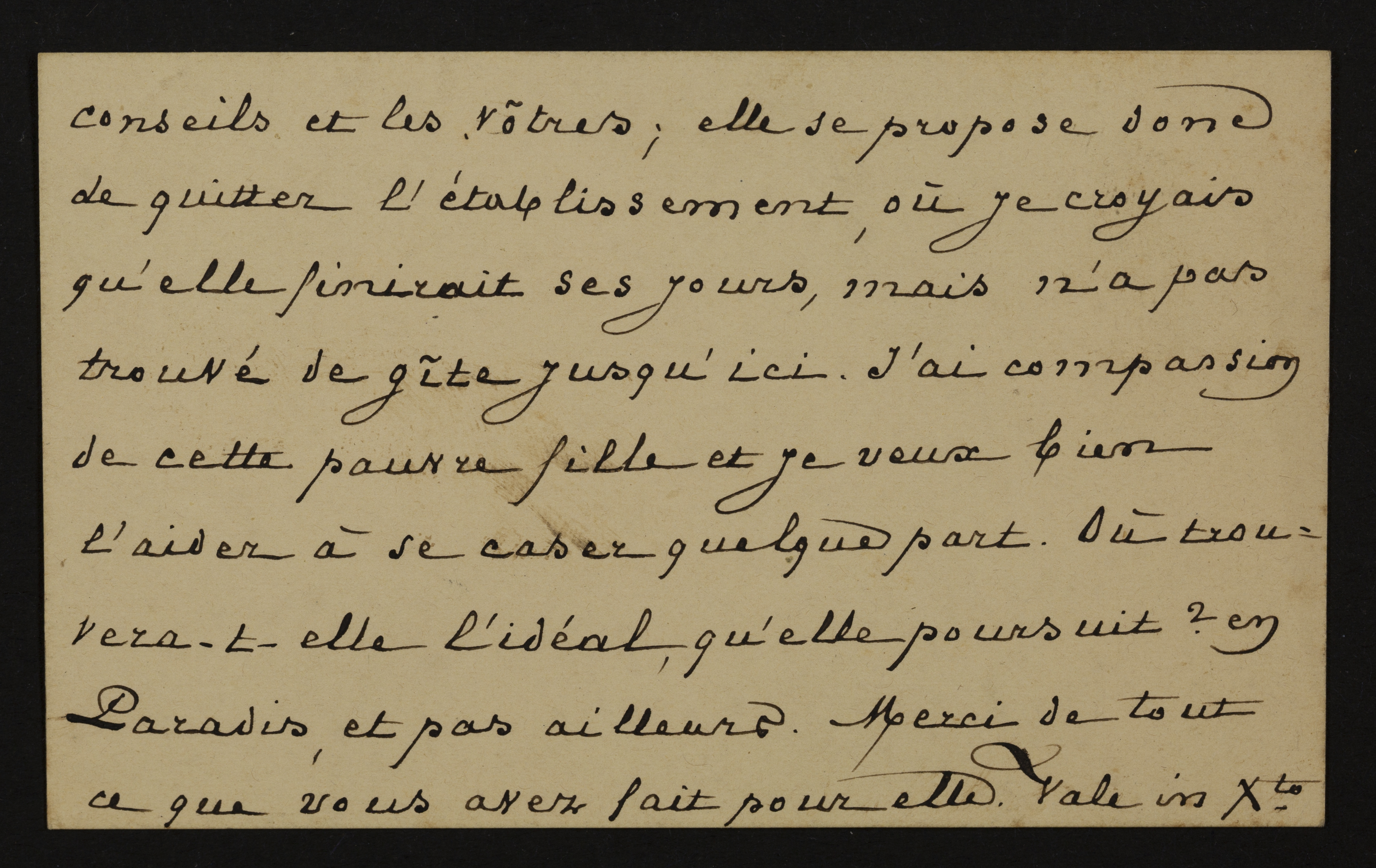 Mlle B. n’a pu se résoudre à suivre mesp2conseils et les vôtres; elle se propose donc de quitter l’établissement, où je croyais qu’elle finirait ses jours,[3] mais n’a pas trouvé de gîte jusqu’ici. J’ai compassion de cette pauvre fille et je veux bien l’aider à se caser quelque part. Où trouvera-t-elle l’idéal qu’elle poursuit? en Paradis, et pas ailleurs. Merci de tout ce que vous avez fait pour elle.