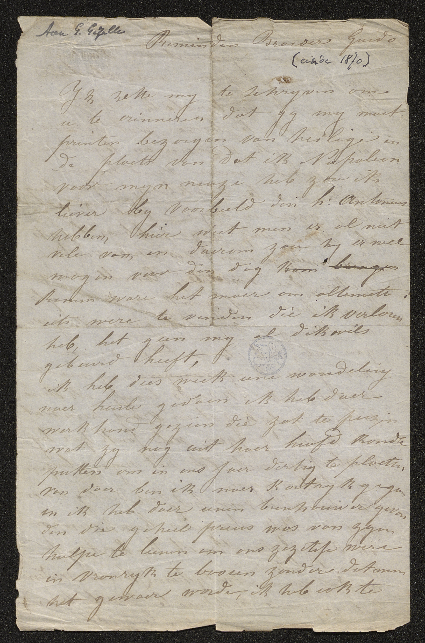 Ik zette my te schryven om u te erinneren dat gy my moet printen bezorgen van heilige in de plaets van dat ik Napoleon voor myn neuze heb zou ik liever bij voorbeeld den h: Antonius hebben, hier weet men er al niet vele van, en daerom zou hij er wel mogen voor den dag komen ware het maer om altemets iets were te vinden die ik verloren heb, het geen my al dikwils gebeurd heeft,[1]