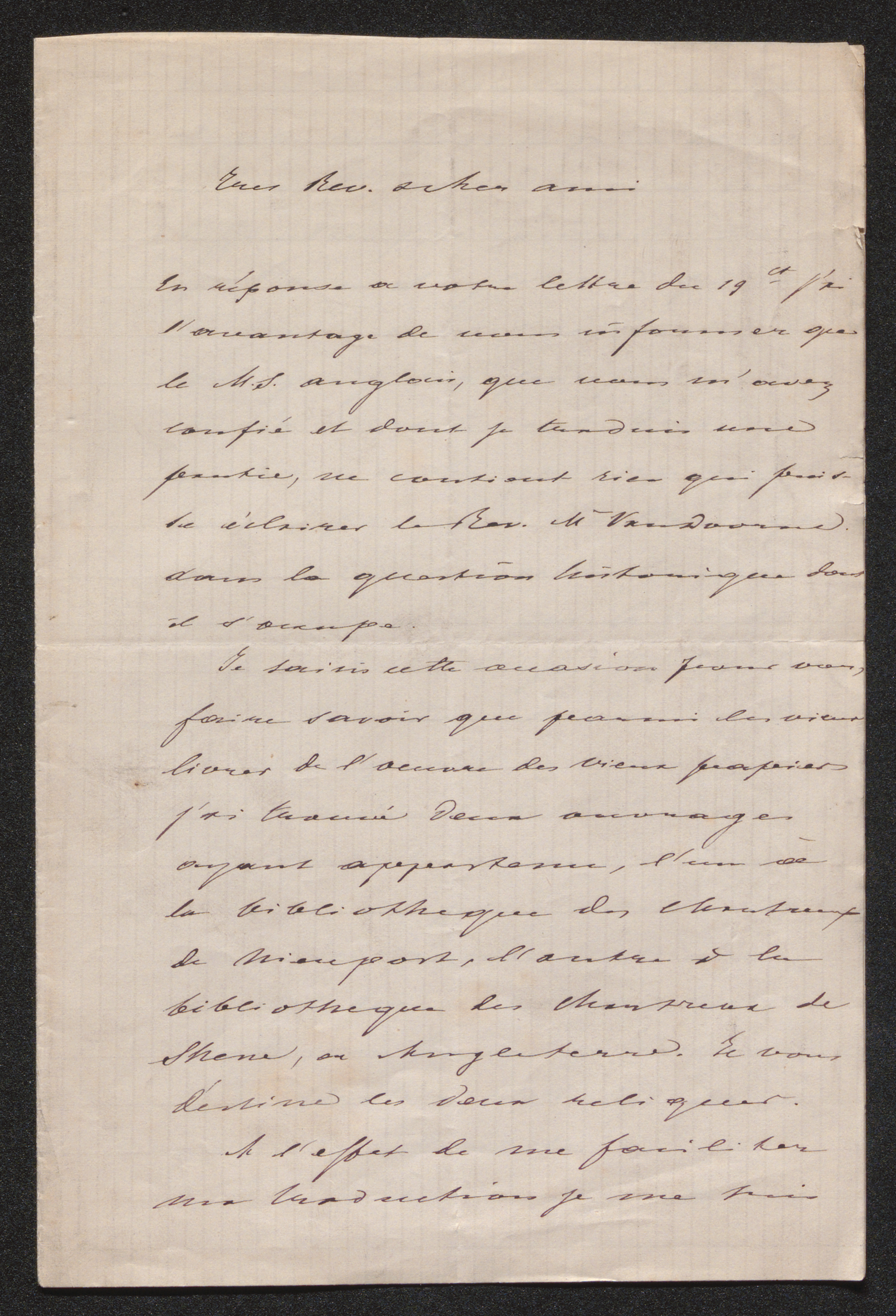 Je saisis cette occasion pour vous faire savoir que parmi les vieux livres de l'oeuvre des vieux papiers j'ai trouvé deux ouvrages ayant appartenu, l'un à la bibliotheque des chartreux de Nieuport, l'autre à la biblioteque des chartreux de Shene, en Angleterre. Je vous destine les deux reliques.[5]