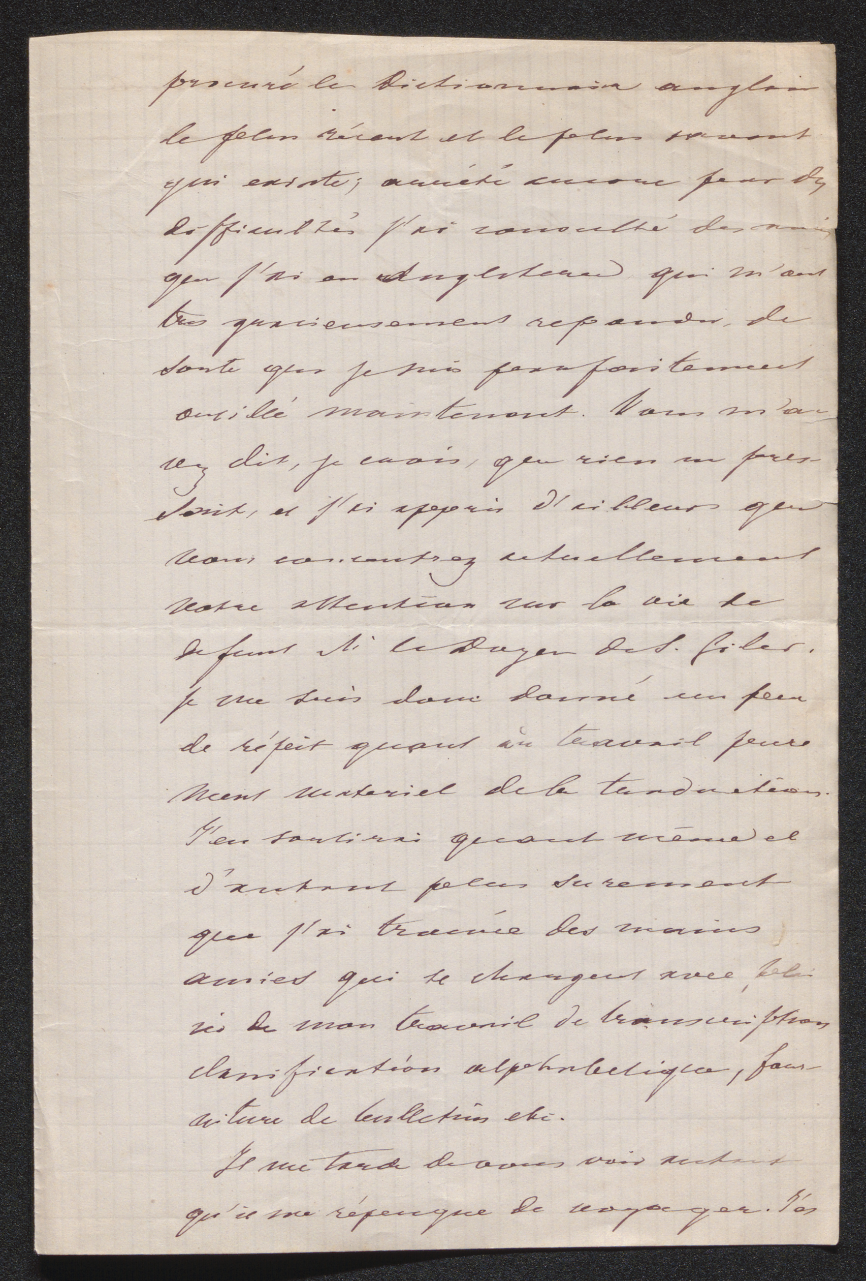 A l'effet de me faciliter ma traduction je me suis p2procuré le dictionnaire anglais le plus récent et le plus savant qui existe; arrété encore par des difficultés j'ai consulté des amis que j'ai en Angleterre qui m'ont tres gracieusement repondu de sorte que je suis parfaitement outillé maintenant. Vous m'avez dit, je crois, que rien ne pressait, et j'ai appris d'ailleurs que vous concentrez actuellement votre attention sur la vie de defunt Mr le Doyen de s. Giles.[6] Je me suis donc donné un peu de répit quant au travail purement materiel de la traduction. J'en sortirai quant même et d'autant plus surement que j'ai trouvé des mains amies qui se chargent avec plaisir de mon travail de transcription, classification alphabetique, fourniture de bulletins etc.