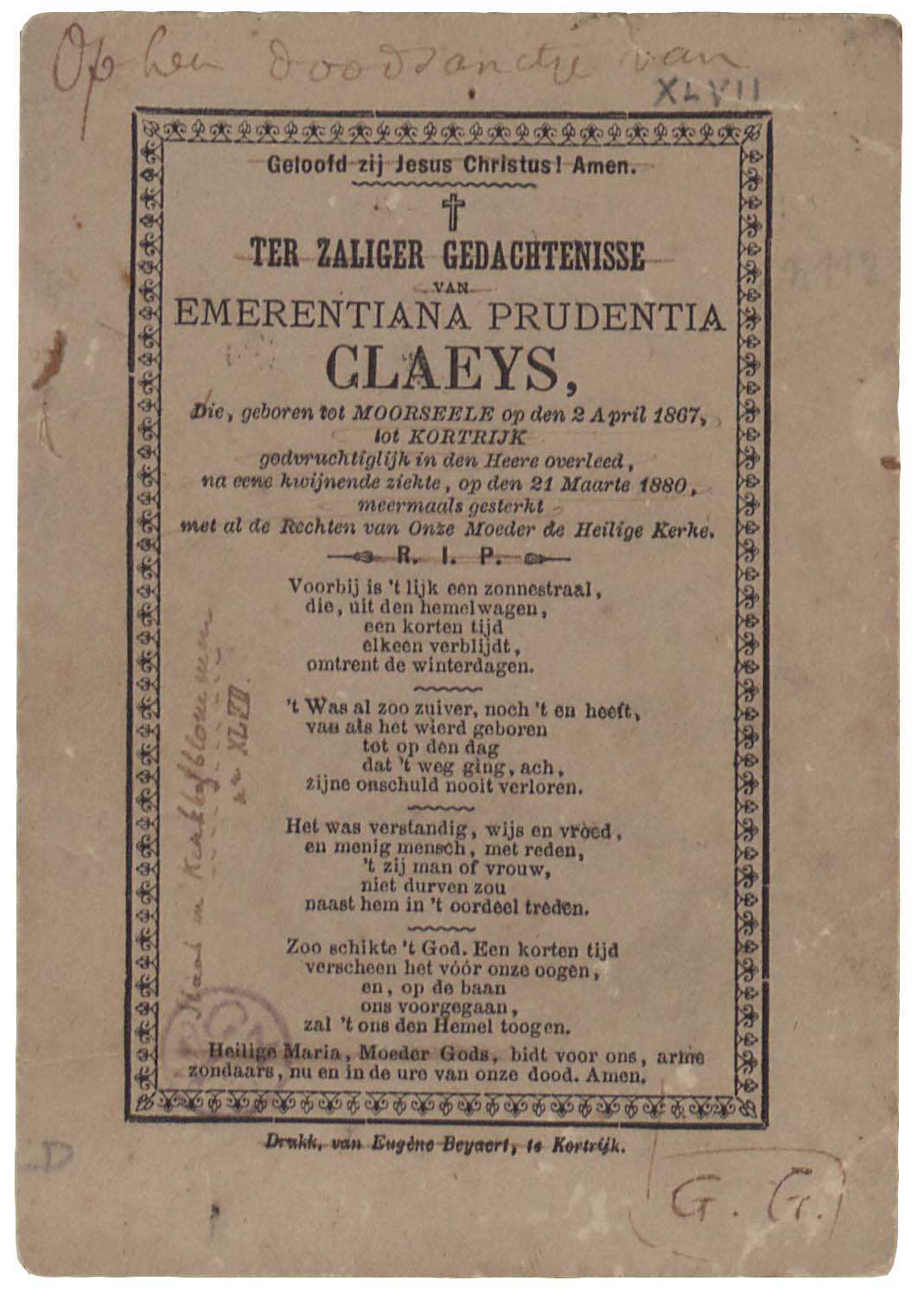 [2] Guido Gezelle publiceerde het gedicht zelf in de Gazette van Kortrijk van 27 maart 1880. Hij liet het ook op een briefkaart drukken om aan beperkte kring rond te sturen. Adolf Duclos nam het op in Rond den Heerd onder de titel ’Op het doodsanctje van Emerentiana Prudentia Claeys’ (Rond den Heerd: 15 (4 april 1880) 19, p.151). Gezelle publiceerde het vervolgens in zijn eerstvolgende uitgave van Kerkhofblommen (1888).