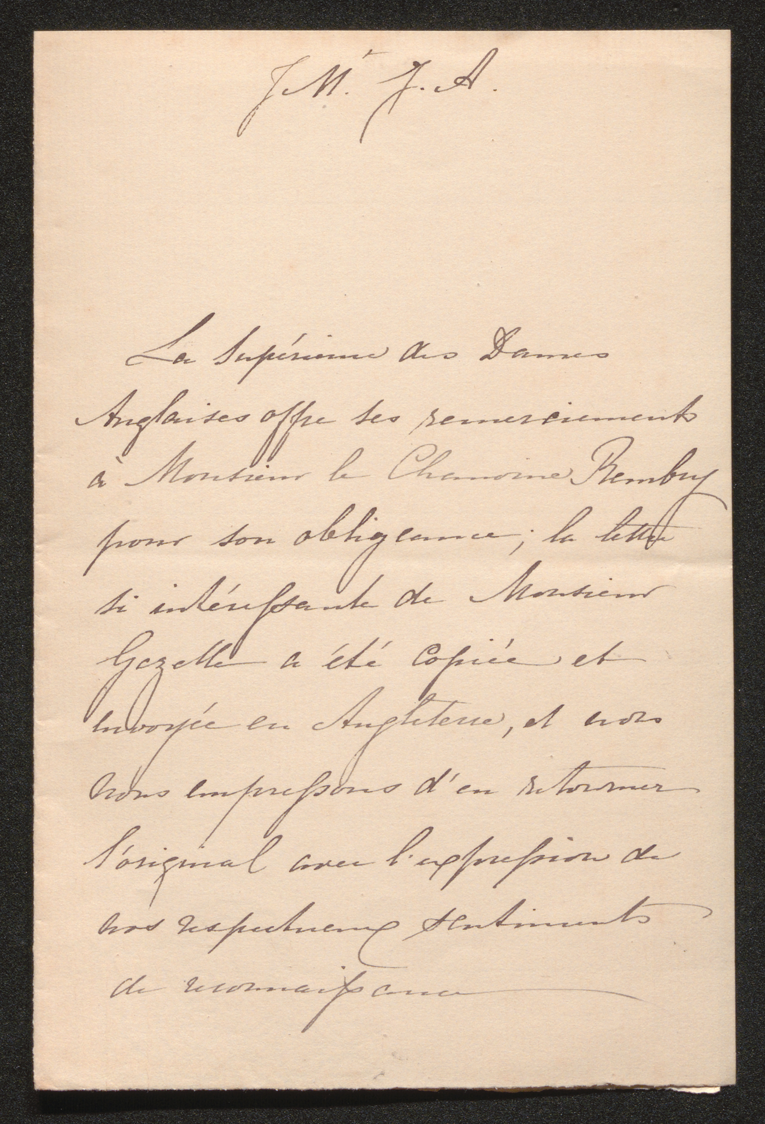 La Supérieure des Dames Anglaises offre ses remerciements à Monsieur le Chanoine Rembry pour son obligeance; la lettre si intéressante de Monsieur Gezelle[2] a été copiée et envoyée en Angleterre et nous nous empressons d’en retourner l’original avec l’expression de nos respectueux sentiments de reconnaissance[3]